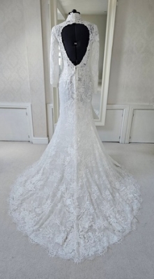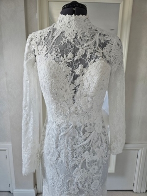 Ivory fitted lace wedding dress with long sleeves, high neck and open back